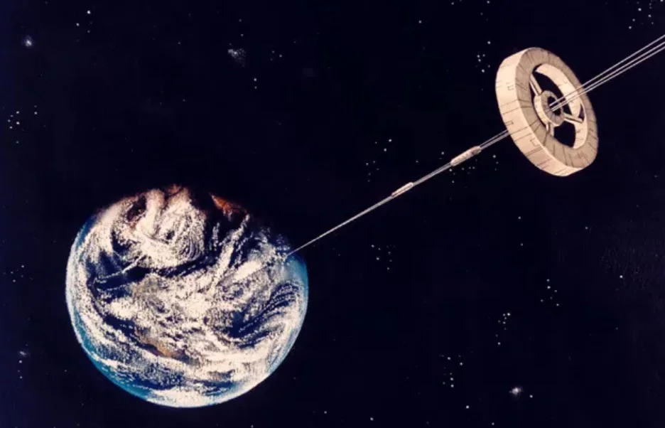 - Um cabo de carbono ultrarresistente preso à superfície da Terra e estendido até uma estação em órbita geossíncrona.